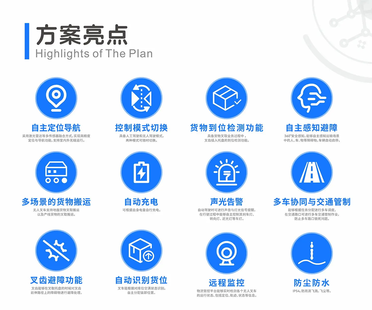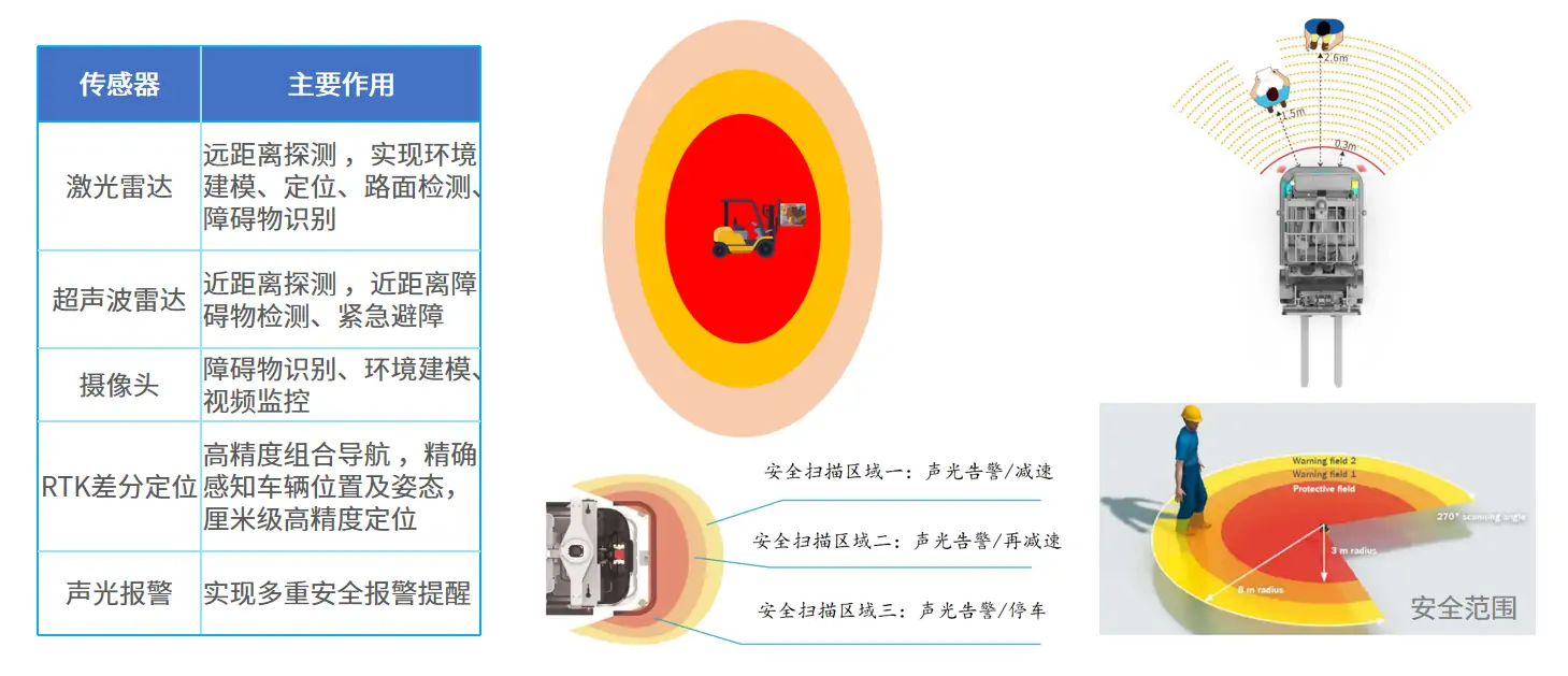 该方案具备多传感器融合感知系统,实现360°多重安全防护。行驶方向激光防撞全覆盖,人员进入一定的安全范围(可调)会触发安全防护,叉车预警、减速、停止,人员离开,叉车自动恢复正常运行。