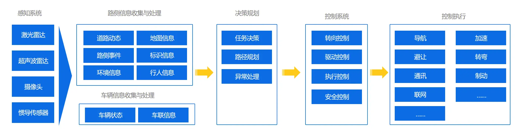 该方案主要由感知系统、决策规划和控制系统与控制执行几部分构成,融合硬件、软件、算法、通信等多种技术,由感知系统对路侧信息与车辆信息进行收集,并通过分析处理,做出决策规划,进行路径规划,并及时处理异常情况,通过控制系统发出指令,最终使车辆按照指令行驶。