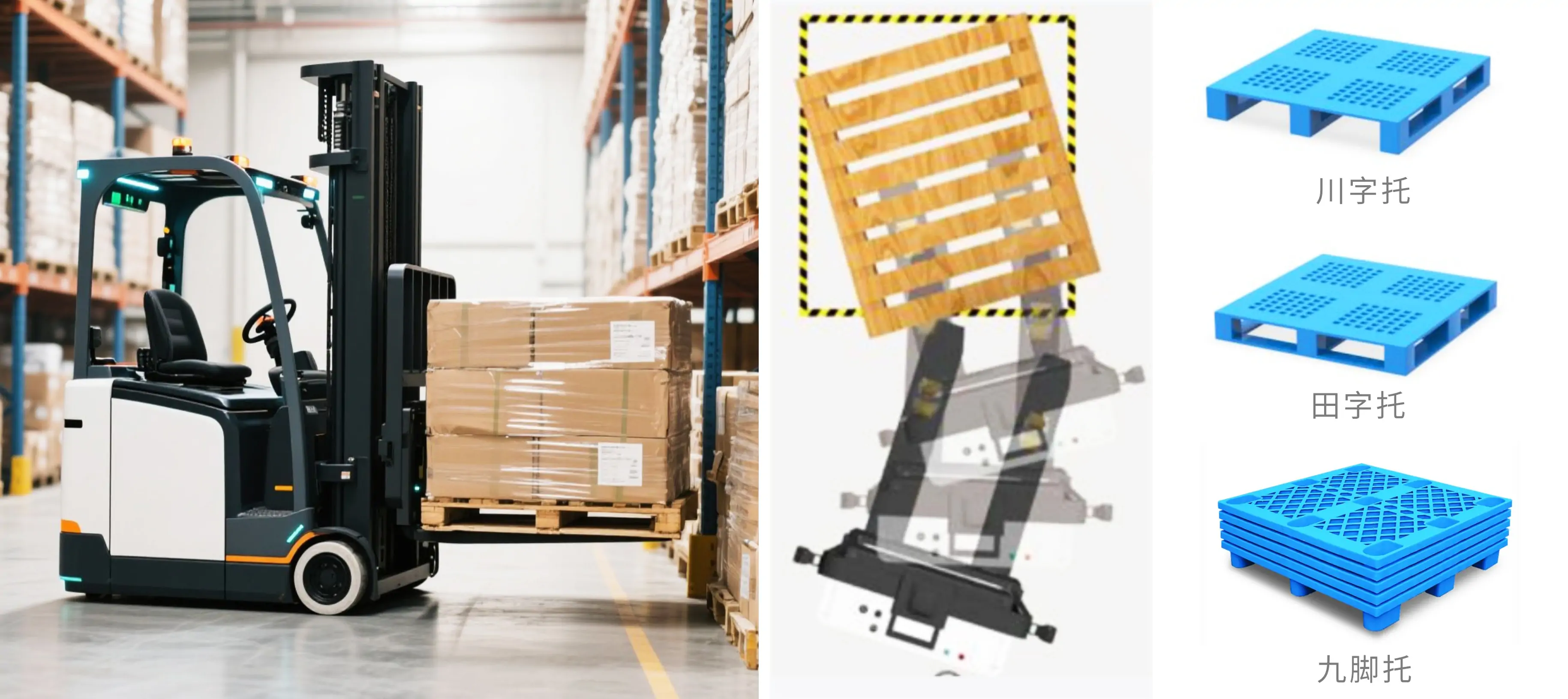 栈板识别:该方案以无人叉车为移动载体,采用突破性创新3D激光SLAM定位技术及视觉技术,配置激光/视觉识别模块,准确识别托盘姿态、位置、动态规划无人叉车路线,对厢式货车进行自动化装卸,兼容川字、田字、九脚等各类型托盘货物装卸,以及车厢内货物叠垛或码放作业,精准进叉,可识别不同类型,不同颜色的托盘。