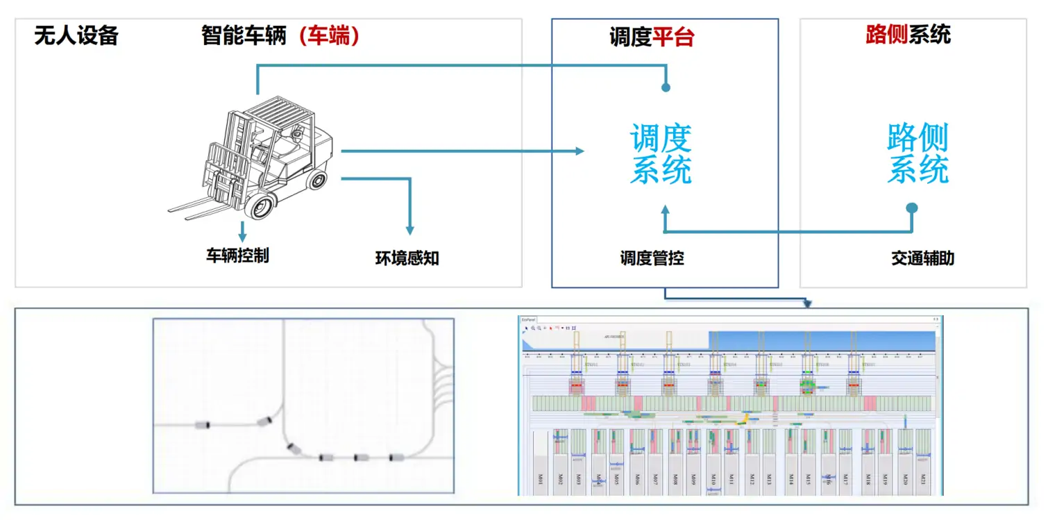 无人叉车作业过程中,通过平台、车端、路侧三个维度确保车辆运输作业安全保障。