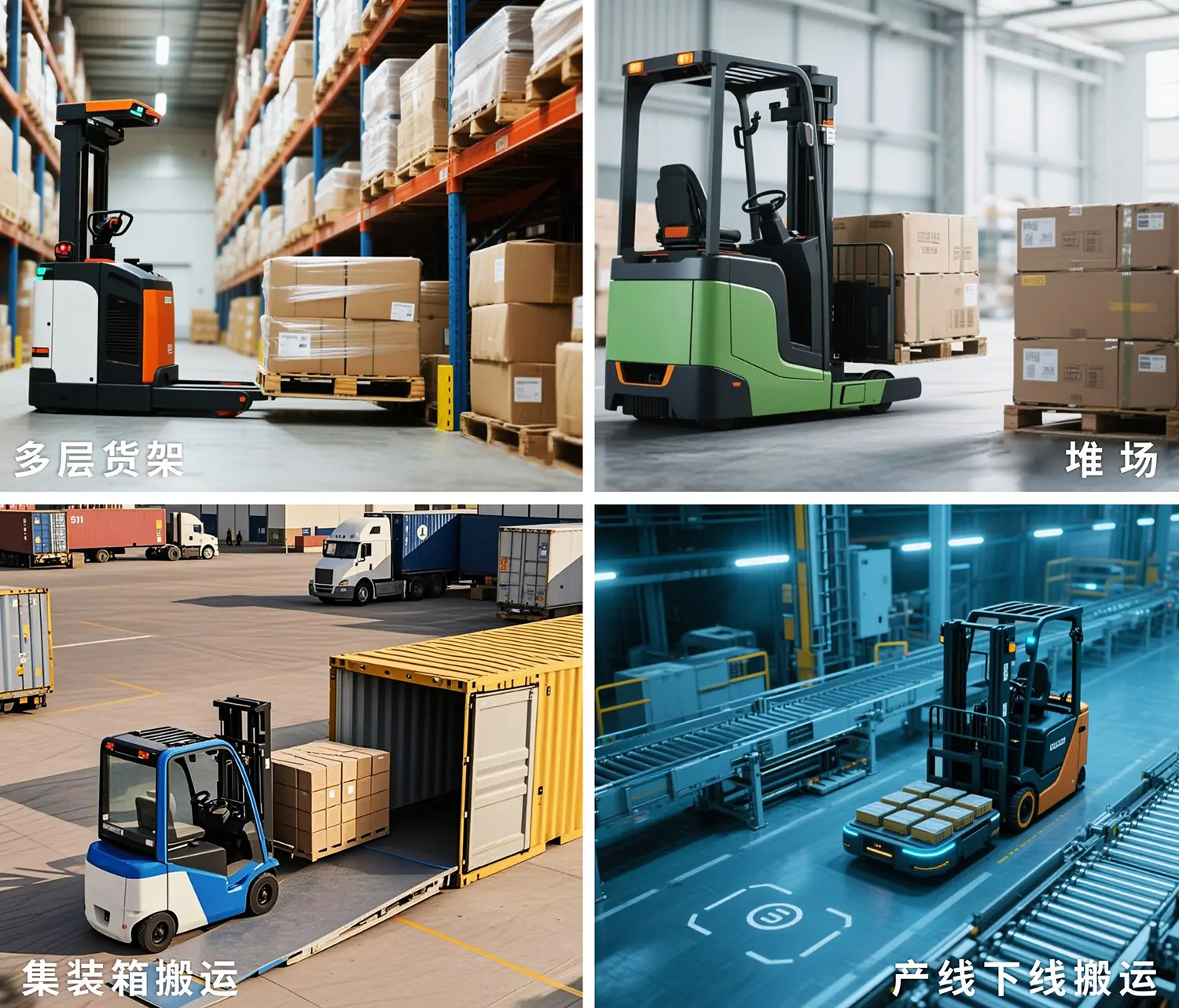 具备室内外无缝切换的运行能力,可高效完成产线、仓库、月台、运输车辆等之间的无人化货物转运、自动上下货、自动堆码、以及进出集装箱装卸货物等任务。