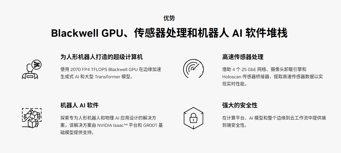 其次,最高支持4个25GbE网络接口、摄像头卸载引擎和Holoscan传感器桥接器,提取高速传感器数据以实现实时性能,满足多传感器融合的高速数据传输需求。并且集成安全启动、可信执行环境、磁盘加密等多重安全特性,保障系统安全无忧。