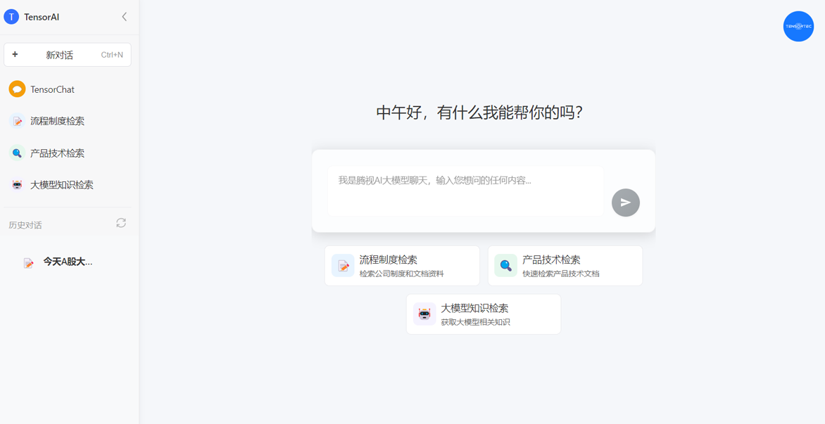 通过TensorChat,用户可以随时开启与腾视科技TensorAI的对话。中午好,有什么我能帮你的吗?这句亲切的问候背后,是TensorAI随时待命的服务态度。无论是流程制度检索,快速查阅公司制度和文档;还是产品技术检索,获取产品技术文档信息,都能高效完成。用户只需输入想问的任何内容,就能得到及时、准确的回应。