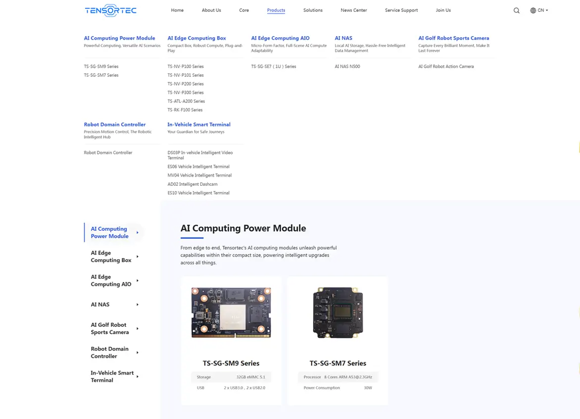 Entering the "Product Center" of the new official website, the full range of smart products from TENSORTEC are neatly displayed. From the "heart" that drives the intelligence of all things to the "terminal tools" for scene implementation, each one carries technological accumulation: