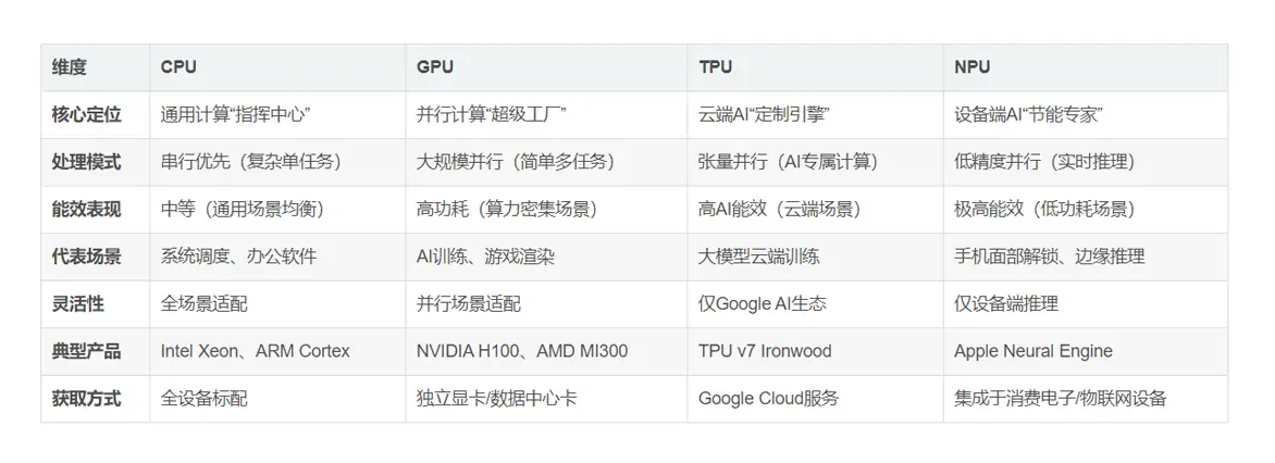 CPU作为“通用基石”,支撑所有设备的基础运行;GPU凭借并行算力,成为AI训练与图形处理的“主力”;TPU在Google生态中深耕云端大模型训练;NPU则让AI从“云端”走向“身边”(手机、手表、汽车)。